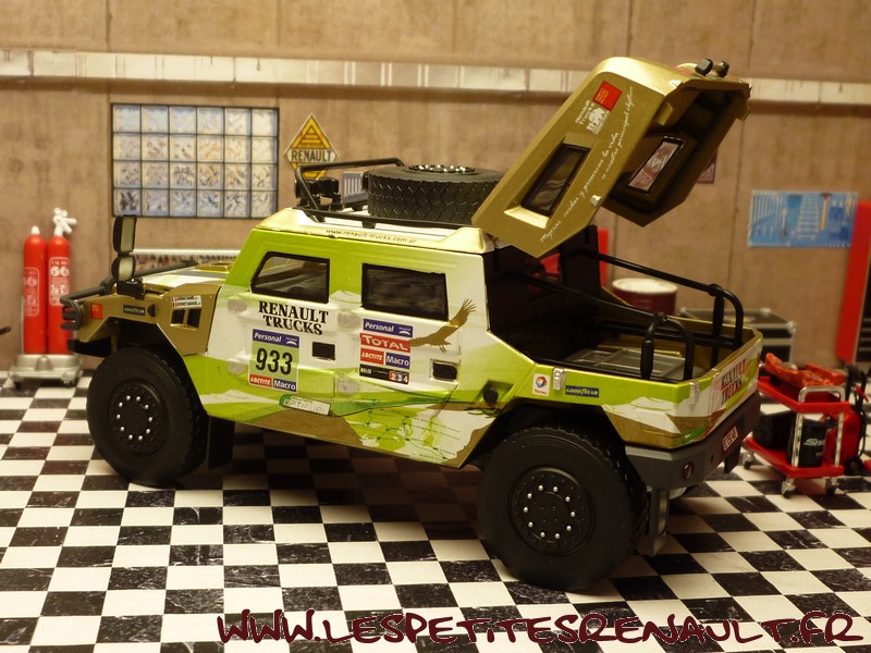Modèle : Sherpa Année : 2011 Course : Dakar Equipage : #933 Adrian - Deswet Couleur : Vert, blanc et or Echelle : 1/43 Fabricant : Eligor Référence 114409 Collection : Non Matière : Zamak, châssis plastique Série limité : Non Boitage : Boite carton + plastique Commentaires : Engagé par Renault Trucks Argentina, il s'agit d'un véhicule de présentation presse |