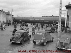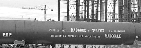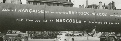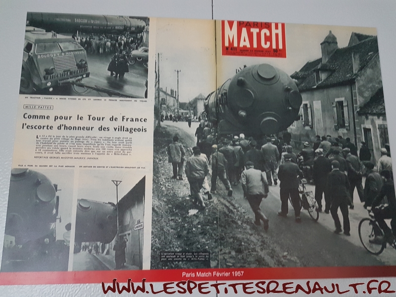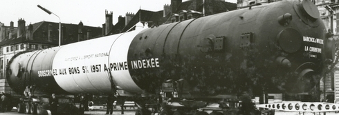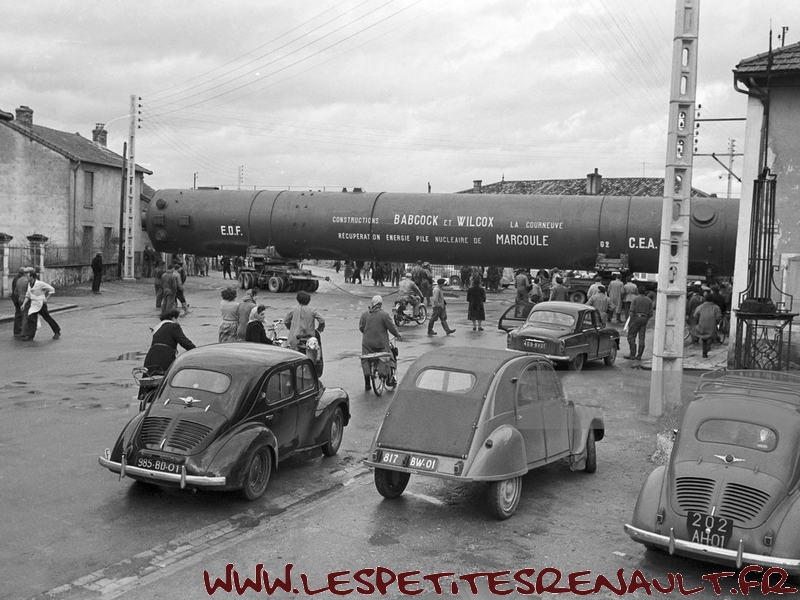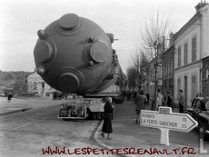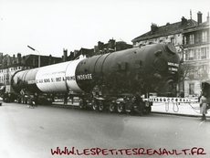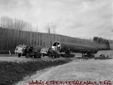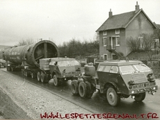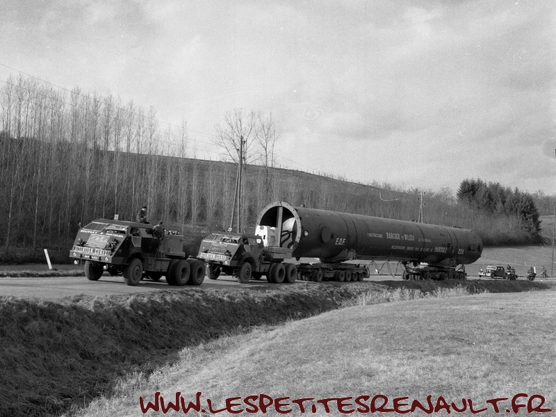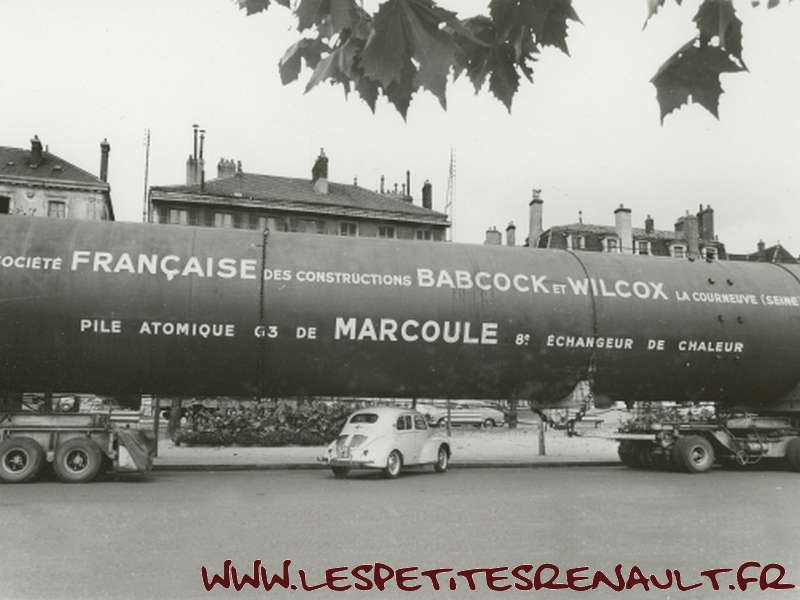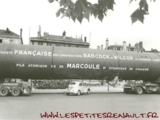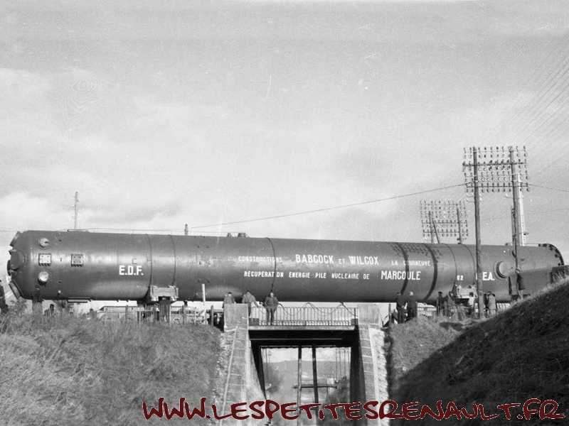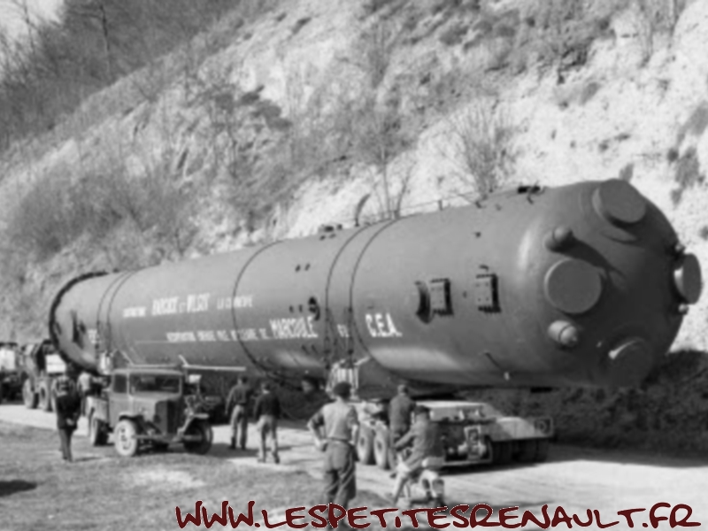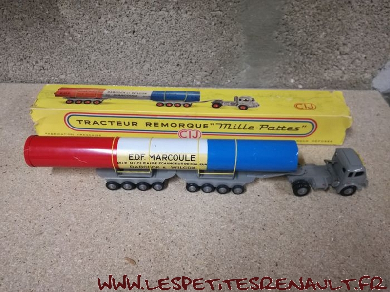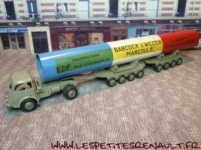 La miniature représente un tracteur mille-pattes Renault Fainéant R4180 de 120 cv modèle 1950 et sa semi-remorque porte échangeur thermique destiné à la pile atomique de Marcoule et reproduit en miniature au 1/50ème. La miniature comporte 2 remorques ainsi que la citerne de l'échangeur. Historiquement il y a eu deux convois de transport d'échangeur de pratiquement 110 tonnes chacun à destination de Marcoule. Un premier en février 1957 destiné au réacteur G3 et un second en Mars 1957 destiné au réacteur G2, les deux réacteurs étant identiques et ayant été construits en parralèlle Contrairement à ce qu'on peut lire régulièrement, il ne s'agit pas du transport d'une pile atomique, mais seulement d'un échangeur de chaleur pour la pile atomique de Marcoule. Cette pièce sert à passer la chaleur du circuit primaire (radioactive) de la centrale au circuit secondaire (non radioactif) où se trouve l'ensemble turbine-alternateur qui va transformer la chaleur en électricité. Cette pièce est aussi appelée générateur de vapeur Il s'agit ici d'un échangeur thermique pour un des UNGG prototypes du centre de Marcoule, la pile elle-même (armatures en acier et blocs de graphite pour la modération) a été montée directement sur place, sans parler des cartouches qui contenaient le combustible à l'uranium naturel. Ces circuits ont été démantelés en 1996. Dans les faits et à la différence de la miniature, ce n'est pas un Fainéant de 120cv qui tracta la pile, mais bien 2 Pacific M25/26 de 270cv chacun, ancien véhicules de l'armée américaine destinés au remorquage des chars pendant la guerre et utilisés par Bourgey Montreuil et lestés de 20 tonnes de béton pour assurer la traction D'un point de vue décoration, il a bien existé un échangeur peint en bleu, blanc et rouge, mais ce n'est ni celui du réacteur G2, ni celui du G3. Il s'agit probablement d'un des 6 autres échangeur qui furent installés par la suite sur d'autres sites. A vide, il pèse 21 tonnes. Sa vitesse maxi est de 42 km/h et il engloutit 150 litres de carburant aux 100 km. |