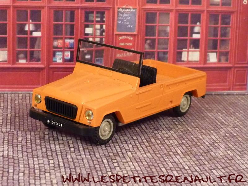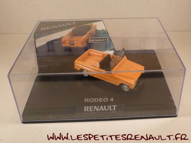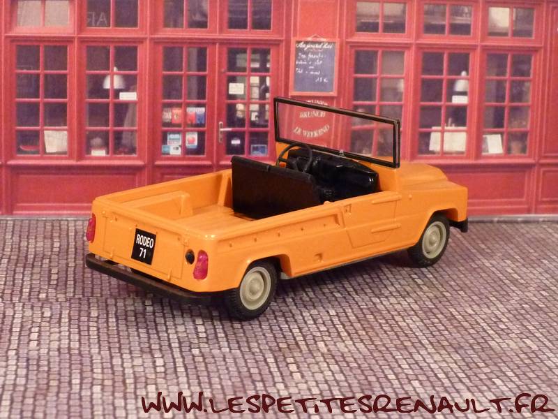 Modèle : Rodeo 4 Evasion Année : 1971 Couleur : Orange Echelle : 1/43 Fabricant : Norev Référence : 7711147403 Collection : Non Matière : Zamak Série limitée : Non Boitage : Boite cristal 12x17 Commentaires : Version sans capote. Fabrication 1997. Vendue uniquement en boutique Renault |