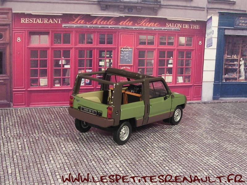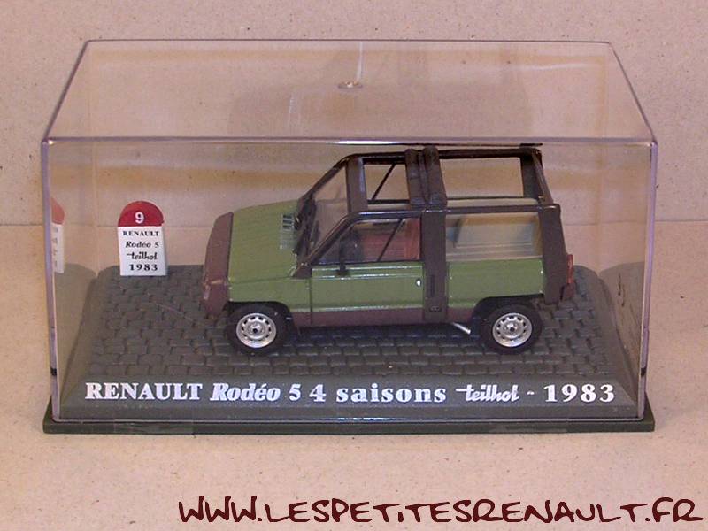 Modèle : Rodeo 5 Teihol Année : 1983 Couleur : Verte et marron Echelle : 1/43 Fabricant : Universal Hobbies Référence : 9bis Collection : Mythique R4 (M6) Matière : Zamak, châssis plastique Série limitée : Non Boitage : Boite cristal + socle pavé Commentaires : Version découverte |
