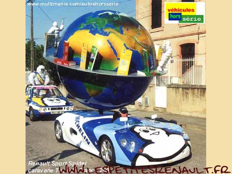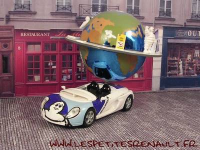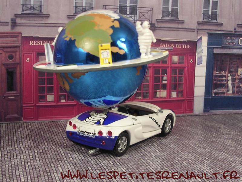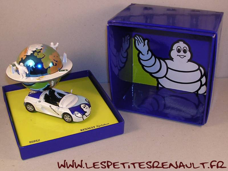 Modèle : Spider Année : 1998 Couleur : Bleu et blanc Echelle : 1/43 Fabricant : Norev Référence : 517900 Collection : Non Matière : Zamak, châssis plastique Série limité : 2443/2500 Boitage : Coffret carton Commentaires : Version Tour de France 2001 avec globe publicitaire. Décoration Michelin. Livré en boite noire en boutique Renault et bleue dans le circuit traditionnel |