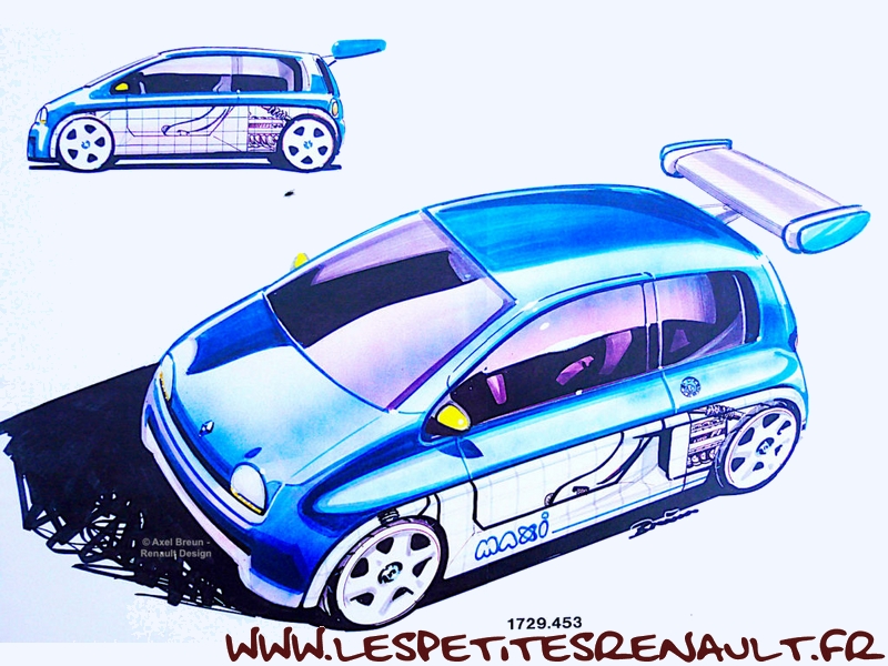 En 1993/1994, alors que la Twingo fête sa première année de commercialisation, le designer Renault Axel Breun (designer Renault, qui sera ensuite responsable des concept-cars Renault de 2009 à 2014. On lui doit entre autres la genèse du concept-car Alpine A110-50), voit ressurgir ses démons et sa passion pour les engins sportifs. Ce jeune talent, qui a suivi Patrick le Quément de Volkswagen à Renault, s'est offert une Berlinette A110 lorsqu'il était jeune conducteur Sa passion pour Alpine est bien vivace. Comme celle qui touche des engins plutôt extrêmes. Et que fait un designer lorsqu'il rentre chez lui après sa journée de travail ? Il continue de concevoir toutes sortes de projets. C'est ainsi que sur son temps libre, Axel Breun va concevoir une Twingo qui repose… sur un châssis de Ferrari 308/328 "J'avais alors constaté que la Twingo et la Ferrari avaient le même empattement. Il me suffisait alors de trouver une Ferrari accidentée pour poursuivre mon projet, car j'avais la caisse d'une Twingo nue, un reste du développement du concept-car Argos !" Axel Breun réalise sa propre maquette sur la base d'une miniature 1/18e, mais il ne trouve pas la Ferrari accidentée dans son budget pour en récupérer le châssis, et le projet en reste là. Enfin, pas tout à fait. Nous sommes alors en 1995 et Renault vient de présenter son Spider qui ouvre la voie à de multiples réflexions. Le projet d'Axel Breun prend alors le chemin officiel du bureau de design. L'idée demeure pratiquement la même : coiffer un châssis de sportive d'une carrosserie de Twingo C'est bien sûr le châssis du Spider qui est retenu, avec toujours cet empattement de 2,34 m. Et le moteur choisi n'est pas n'importe lequel : c'est le V10 de la F1 ! Ce même moteur qui vient de se loger dans la caisse d'un Espace présenté au salon de Paris 1994 ! Axel Breun confira plus tard que ce programme fut poussé jusqu'au stade de la maquette 1/5e mais n'ira hélas pas plus loin. |